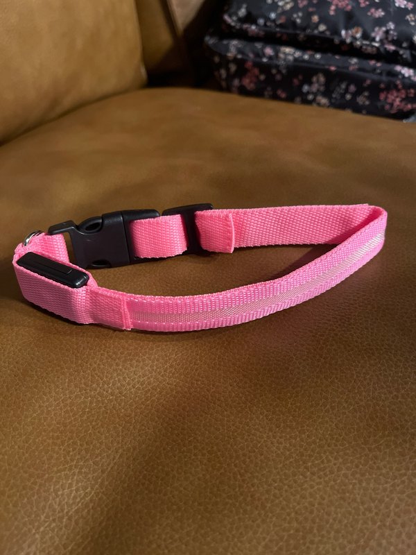 Ошейник лёгкий, собака носит его без проблем. Светится разными цветами, смотрится прикольно.
